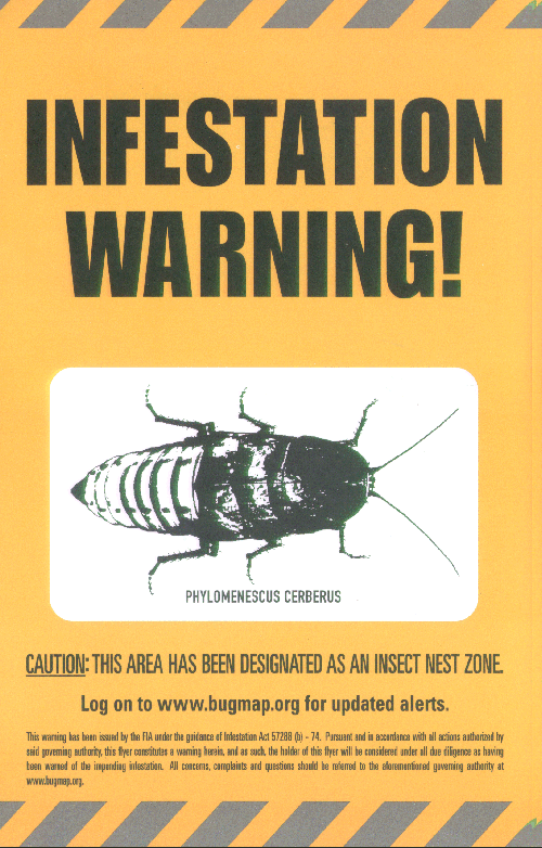 Blurring the line between reality and entertainment One of my cast members recently returned from New York (where he saw a preview performance of the upcoming Man Who Came to Dinner revival with Nathan Lane). He brought back the flyer pictured here, thinking it was cute because yes, there are lots of roaches in New York, and roaches also have a small role in The Man Who Came to Dinner. I finally got around to going to the website mentioned on the flyer, www.bugmap.org. It shows a photo of the bug, mentions how nasty it is, and displays a map of the US showing areas already infested. There is a blank where you can enter your zip code to see when the critter is projected to spread to your neck of the woods. I did so (the map already showed it in southern Georgia), and was let to a trailer for am icky-bug disaster movie premiering next week on the USA cable channel. Nowhere on the flyer is there any indication that this was promotional material. Fooled me. I still won’t watch the movie, though.
